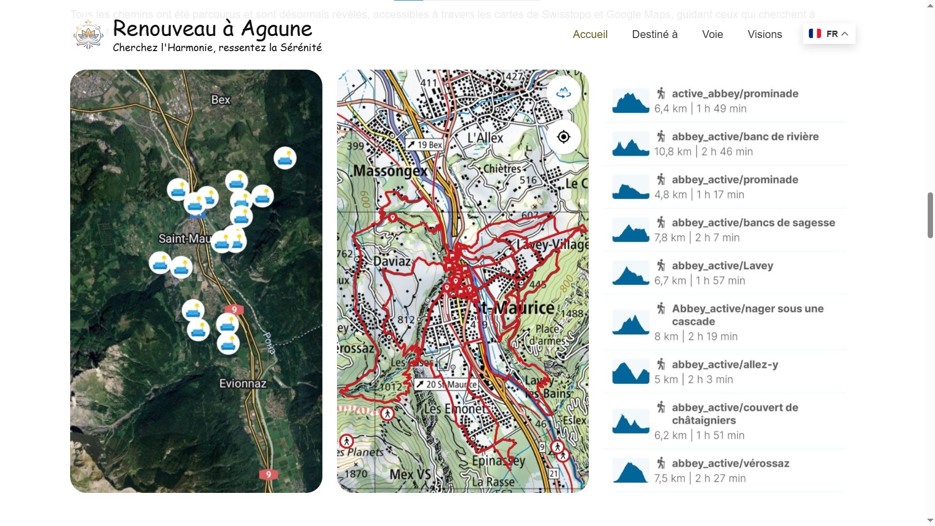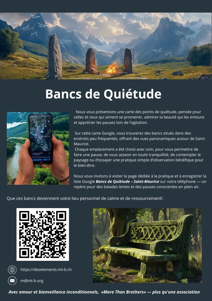 Le projet « Des Éléments » est une plateforme numérique gratuite de pratiques autonomes pour la régénération et l’introspection en milieu naturel à Saint-Maurice. La plateforme propose 4 pratiques. Sa carte recense 25 points de retraite et 8 itinéraires sur fond de cartes SwissTopo. Un coach IA répond sur demande et ne conserve aucune donnée personnelle. Le projet est soutenu par des subventions, des fondations et des apports partenaires.