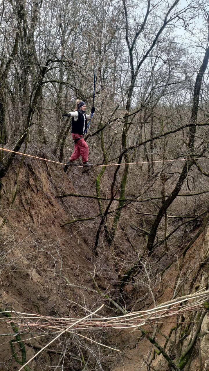Pratique de la marche consciente sur une sangle tendue, développant équilibre, concentration et ancrage dans le moment présent. - Ponts suspendus et bûches: